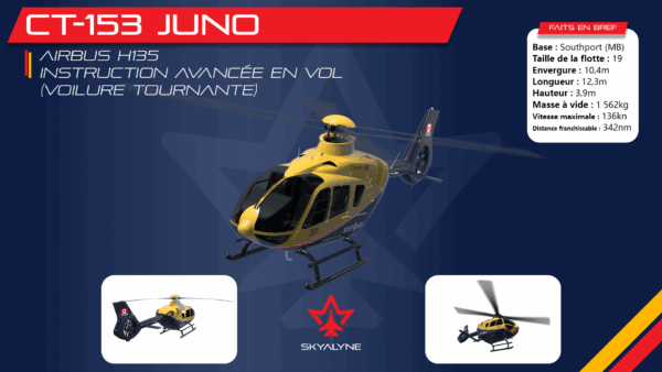 SkyAlyne a choisi les hélicoptères bimoteurs H135 (rebaptisés « CT-153 Juno » par l’Aviation royale canadienne) comme plateforme d’entraînement pour le personnel de l’ARC appelé à piloter des aéronefs à voilure tournante. Ce sont ces appareils qui prépareront la prochaine génération de pilotes aux missions de demain.